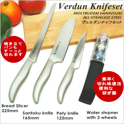 ◎<エントリーでポイント10倍!>≪送料無料、但し沖縄は1000円≫<当店オリジナルセット>ヴェルダン包丁セット4点 ぺティナイフ・三徳庖丁・パン切・研ぎ器