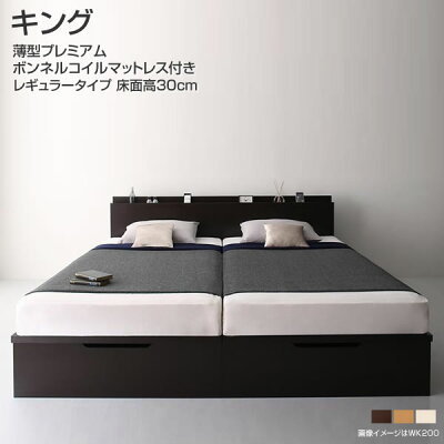お客様組立 跳ね上げベッド キング (セミシングル+シングル) 縦開き 深さレギュラー 跳ね上げ式ベッド マットレス付き ガス圧 収納ベッド ベッド 跳ね上げ式 大容量 宮付き コンセント 北欧風 木製 新婚 夫婦 大型ベッド 薄型プレミアムボンネルコイルマットレス付き